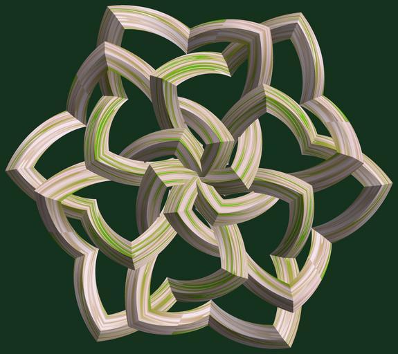| Keywords: mathematica 3d cg parametricplot3d texture torus code program algorithm プログラム コード アルゴリズム 輪環 りんかん ドーナツ どーなつ 四芒星 しぼうせい geometric sculpture geometricsculpture shape geometry sculpture mapping テクスチャ マッピング 模様 もよう abstract 抽象 ちゅうしょう アブストラクト design pattern デザイン パターン graphic グラフィック グラフィクス structure 意匠 構造 symmetry 対称性 たいしょうせい シンメトリー 対称 たいしょう tangle a = 6; (* center hole size *) b = 4; (* tetra-torus *) c = 4; (* distance from the center of rotation *) d = 6; (* number of torus *) h = 3; (* height of a torus *) SetOptions[ParametricPlot3D, PlotRange -> Full, Mesh -> None, Boxed -> False, Axes -> False, PlotPoints -> 400, ImageSize -> 3000, Background -> RGBColor[{20, 50, 30}/255], PlotStyle -> Directive[Specularity[White, 70], Texture[Import["D:/tmp/862.jpg"]]], TextureCoordinateFunction -> ({#4 + #5, #5 / Pi} &), Lighting -> "Neutral"]; f[v_] := TriangleWave[{-1, 1}, v/(2 Pi)]; g[v_] := TriangleWave[{-1, 1}, v/(2 Pi) + 1/4]; x = (a - g[t] - f[b s]) Cos[s] + c; y = (a - g[t] - f[b s]) Sin[s] + c; z = (a - f[t] - h f[b s]); rm = Table[{x, y, z}.RotationMatrix[2 i Pi/d, {0, 0, 1}], {i, d}]; ParametricPlot3D[rm, {t, 0, 2 Pi}, {s, 0, Pi}] (*--- The Texture *) a = 6; (* center hole size *) b = 4; (* tetra-torus *) c = 4; (* distance from the center of rotation *) d = 6; (* number of torus *) h = 3; (* height of a torus *) SetOptions[ParametricPlot3D, PlotRange -> Full, Mesh -> None, Boxed -> False, Axes -> False, PlotPoints -> 400, ImageSize -> 3000, Background -> RGBColor[{20, 50, 30}/255], PlotStyle -> Directive[Specularity[White, 70], Texture[Import["D:/tmp/862.jpg"]]], TextureCoordinateFunction -> ({#4 + #5, #5 / Pi} &), Lighting -> "Neutral"]; f[v_] := TriangleWave[{-1, 1}, v/(2 Pi)]; g[v_] := TriangleWave[{-1, 1}, v/(2 Pi) + 1/4]; x = (a - g[t] - f[b s]) Cos[s] + c; y = (a - g[t] - f[b s]) Sin[s] + c; z = (a - f[t] - h f[b s]); rm = Table[{x, y, z}.RotationMatrix[2 i Pi/d, {0, 0, 1}], {i, d}]; ParametricPlot3D[rm, {t, 0, 2 Pi}, {s, 0, Pi}] (*--- The Texture *) |