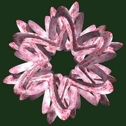 | Keywords: mathematica 3d cg parametricplot3d texture torus 輪環 りんかん ドーナツ どーなつ 四芒星 しぼうせい 四光星 しこうせい 四稜星 しりょうせい code program algorithm コード プログラム アルゴリズム geometric sculpture geometricsculpture shape geometry sculpture mapping テクスチャ マッピング 模様 もよう abstract 抽象 ちゅうしょう アブストラクト design pattern デザイン パターン graphic グラフィック グラフィクス structure 意匠 構造 symmetry 対称性 たいしょうせい シンメトリー 対称 たいしょう algorithm コード plant blossom black background pastel outdoor organic pattern serene flower cluster foliage flower macro a = 3; (* center hole size of a torus *) b = 4; (* tetra-torus *) c = 0; (* distance from the center of rotation *) d = 6; (* number of torus *) h = 1; (* height of a torus *) SetOptions[ParametricPlot3D, PlotRange -> Full, Mesh -> None, Boxed -> False, Axes -> False, PlotPoints -> 400, ImageSize -> 3000, Background -> RGBColor[{25, 50, 25}/255], PlotStyle -> Directive[Specularity[White, 30], Texture[Import["D:/tmp/86.jpg"]]], TextureCoordinateFunction -> ({#4, #5 2 Pi} &), Lighting -> "Neutral"]; f[v_] := Cos[2 Cos[Cos[Cos[v]]]]; x = (a - f[t] - Sin[b s]) Cos[s + 3 Pi/(4 b)] + c; y = (a - f[t] - Sin[b s]) Sin[s + 3 Pi/(4 b)] + c; z = (a - Sin[t/2] - h Sin[b s]); rot = Table[{x, y, z}.RotationMatrix[2 i Pi/d, {1, 1, 0}], {i, d}]; ParametricPlot3D[rot, {t, 0, 2 Pi}, {s, 0, 2 Pi}] (*--- The Texture *) a = 3; (* center hole size of a torus *) b = 4; (* tetra-torus *) c = 0; (* distance from the center of rotation *) d = 6; (* number of torus *) h = 1; (* height of a torus *) SetOptions[ParametricPlot3D, PlotRange -> Full, Mesh -> None, Boxed -> False, Axes -> False, PlotPoints -> 400, ImageSize -> 3000, Background -> RGBColor[{25, 50, 25}/255], PlotStyle -> Directive[Specularity[White, 30], Texture[Import["D:/tmp/86.jpg"]]], TextureCoordinateFunction -> ({#4, #5 2 Pi} &), Lighting -> "Neutral"]; f[v_] := Cos[2 Cos[Cos[Cos[v]]]]; x = (a - f[t] - Sin[b s]) Cos[s + 3 Pi/(4 b)] + c; y = (a - f[t] - Sin[b s]) Sin[s + 3 Pi/(4 b)] + c; z = (a - Sin[t/2] - h Sin[b s]); rot = Table[{x, y, z}.RotationMatrix[2 i Pi/d, {1, 1, 0}], {i, d}]; ParametricPlot3D[rot, {t, 0, 2 Pi}, {s, 0, 2 Pi}] (*--- The Texture *) |