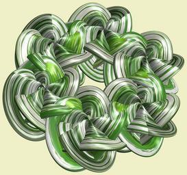 | Keywords: mathematica 3d cg parametricplot3d texture torus code program algorithm プログラム コード アルゴリズム 輪環 りんかん ドーナツ どーなつ トーラス とーらす knot 結び目 むすびめ mapping テクスチャ マッピング 模様 もよう design pattern デザイン パターン graphic グラフィック グラフィクス structure 意匠 構造 symmetry 対称性 たいしょうせい シンメトリー 対称 たいしょう indoor drawing white background a = 6; (* center hole size of a torus *) b1 = 5;(* the number of angles *) b2 = 2;(* the number of waves *) b3 = 3; (* the number of knots *) c = 12; (* distance from the center of rotation *) d = 6; (* the number of tori *) h1 = 5; (* width of a torus *) h2 = 2; (* width of a torus *) h3 = 7; (* height of cross *) SetOptions[ParametricPlot3D, PlotRange -> Full, Mesh -> None, Boxed -> False, Axes -> None, PlotPoints -> 500, ImageSize -> 3000, Background -> RGBColor[{240, 240, 200}/255], PlotStyle -> Directive[Specularity[White, 50], Texture[Import["D:/tmp/911.jpg"]]], TextureCoordinateFunction -> ({#4, #5 /Pi} &), Lighting -> "Neutral"]; x = (a - h1 Cos[t] + h2 Sin[b1 s]) Cos[b3 s] + c; y = (a - h1 Cos[t] + h2 Sin[b1 s]) Sin[b3 s] + c; z = h3 Cos[b1 s] + Sin[b2 t] + c; rm = Table[{x, y, z}.RotationMatrix[2 i Pi/d, {0, 0, 1}], {i, d}]; ParametricPlot3D[rm, {t, 0, 2 Pi}, {s, 0, 2 Pi}] (*--- The Texture *) a = 6; (* center hole size of a torus *) b1 = 5;(* the number of angles *) b2 = 2;(* the number of waves *) b3 = 3; (* the number of knots *) c = 12; (* distance from the center of rotation *) d = 6; (* the number of tori *) h1 = 5; (* width of a torus *) h2 = 2; (* width of a torus *) h3 = 7; (* height of cross *) SetOptions[ParametricPlot3D, PlotRange -> Full, Mesh -> None, Boxed -> False, Axes -> None, PlotPoints -> 500, ImageSize -> 3000, Background -> RGBColor[{240, 240, 200}/255], PlotStyle -> Directive[Specularity[White, 50], Texture[Import["D:/tmp/911.jpg"]]], TextureCoordinateFunction -> ({#4, #5 /Pi} &), Lighting -> "Neutral"]; x = (a - h1 Cos[t] + h2 Sin[b1 s]) Cos[b3 s] + c; y = (a - h1 Cos[t] + h2 Sin[b1 s]) Sin[b3 s] + c; z = h3 Cos[b1 s] + Sin[b2 t] + c; rm = Table[{x, y, z}.RotationMatrix[2 i Pi/d, {0, 0, 1}], {i, d}]; ParametricPlot3D[rm, {t, 0, 2 Pi}, {s, 0, 2 Pi}] (*--- The Texture *) |