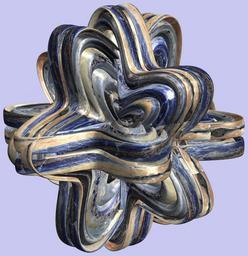 | Keywords: mathematica 3d cg parametricplot3d texture torus code program algorithm プログラム コード アルゴリズム 輪環 りんかん ドーナツ どーなつ トーラス とーらす mapping テクスチャ マッピング 模様 もよう abstract 抽象 ちゅうしょう アブストラクト design pattern デザイン パターン graphic グラフィック グラフィクス structure 意匠 構造 symmetry 対称性 たいしょうせい シンメトリー 対称 たいしょう indoor white background surreal a = 7; (* center hole size of a torus *) b1 = 6;(* the number of angles *) b2 = 6;(* the number of waves *) c = 1.3; (* distance from the center of rotation *) d = 6; (* the number of tori *) h1 = 6; (* width of a torus *) h2 = 3; (* width of a torus *) SetOptions[ParametricPlot3D, PlotRange -> Full, Mesh -> None, Boxed -> False, Axes -> None, PlotPoints -> 500, ImageSize -> 3000, Background -> RGBColor[{200, 200, 240}/255], PlotStyle -> Directive[Specularity[White, 70], Texture[Import["D:/tmp/94.jpg"]]], TextureCoordinateFunction -> ({#4, #5 Pi} &), Lighting -> "Neutral"]; x = (a - h1 Cos[t] + h2 Sin[b1 s]) Cos[s + Pi/(2 b1)]; y = (a - h1 Cos[t] + h2 Sin[b1 s]) Sin[s + Pi/(2 b1)]; z = Sin[b2 t] + c; vc = {{0, 0, 1}, {0, 0, -1}, {0, 1, 0}, {0, -1, 0}, {1, 0, 0}, {-1, 0, 0}}; rm = Table[{x, y, z}.RotationMatrix[{{0, 0, 1}, vc[[i]]}], {i, d}]; ParametricPlot3D[rm, {t, 0, 2 Pi}, {s, 0, 2 Pi}] (*--- The Texture *) a = 7; (* center hole size of a torus *) b1 = 6;(* the number of angles *) b2 = 6;(* the number of waves *) c = 1.3; (* distance from the center of rotation *) d = 6; (* the number of tori *) h1 = 6; (* width of a torus *) h2 = 3; (* width of a torus *) SetOptions[ParametricPlot3D, PlotRange -> Full, Mesh -> None, Boxed -> False, Axes -> None, PlotPoints -> 500, ImageSize -> 3000, Background -> RGBColor[{200, 200, 240}/255], PlotStyle -> Directive[Specularity[White, 70], Texture[Import["D:/tmp/94.jpg"]]], TextureCoordinateFunction -> ({#4, #5 Pi} &), Lighting -> "Neutral"]; x = (a - h1 Cos[t] + h2 Sin[b1 s]) Cos[s + Pi/(2 b1)]; y = (a - h1 Cos[t] + h2 Sin[b1 s]) Sin[s + Pi/(2 b1)]; z = Sin[b2 t] + c; vc = {{0, 0, 1}, {0, 0, -1}, {0, 1, 0}, {0, -1, 0}, {1, 0, 0}, {-1, 0, 0}}; rm = Table[{x, y, z}.RotationMatrix[{{0, 0, 1}, vc[[i]]}], {i, d}]; ParametricPlot3D[rm, {t, 0, 2 Pi}, {s, 0, 2 Pi}] (*--- The Texture *) |