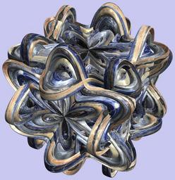 | Keywords: mathematica 3d cg parametricplot3d texture torus code program algorithm プログラム コード アルゴリズム 輪環 りんかん ドーナツ どーなつ トーラス とーらす mapping テクスチャ マッピング 模様 もよう abstract 抽象 ちゅうしょう アブストラクト design pattern デザイン パターン graphic グラフィック グラフィクス structure 意匠 構造 symmetry 対称性 たいしょうせい シンメトリー 対称 たいしょう white background tangle motorcycle bike vehicle a = 7; (* center hole size of a torus *) b1 = 6;(* the number of angles *) b2 = 6;(* the number of waves *) c = 9; (* distance from the center of rotation *) d = 6; (* the number of tori *) h1 = 6; (* width of a torus *) h2 = 3; (* width of a torus *) SetOptions[ParametricPlot3D, PlotRange -> Full, Mesh -> None, Boxed -> False, Axes -> None, PlotPoints -> 500, ImageSize -> 3000, Background -> RGBColor[{200, 200, 240}/255], PlotStyle -> Directive[Specularity[White, 70], Texture[Import["D:/tmp/94.jpg"]]], TextureCoordinateFunction -> ({#4, #5 Pi} &), Lighting -> "Neutral"]; x = (a - h1 Cos[t] + h2 Sin[b1 s]) Cos[s + Pi/(2 b1)]; y = (a - h1 Cos[t] + h2 Sin[b1 s]) Sin[s + Pi/(2 b1)]; z = Sin[b2 t] + c; vc = {{0, 0, 1}, {0, 0, -1}, {0, 1, 0}, {0, -1, 0}, {1, 0, 0}, {-1, 0, 0}}; rm = Table[{x, y, z}.RotationMatrix[{{0, 0, 1}, vc[[i]]}], {i, d}]; ParametricPlot3D[rm, {t, 0, 2 Pi}, {s, 0, 2 Pi}] (*--- The Texture *) a = 7; (* center hole size of a torus *) b1 = 6;(* the number of angles *) b2 = 6;(* the number of waves *) c = 9; (* distance from the center of rotation *) d = 6; (* the number of tori *) h1 = 6; (* width of a torus *) h2 = 3; (* width of a torus *) SetOptions[ParametricPlot3D, PlotRange -> Full, Mesh -> None, Boxed -> False, Axes -> None, PlotPoints -> 500, ImageSize -> 3000, Background -> RGBColor[{200, 200, 240}/255], PlotStyle -> Directive[Specularity[White, 70], Texture[Import["D:/tmp/94.jpg"]]], TextureCoordinateFunction -> ({#4, #5 Pi} &), Lighting -> "Neutral"]; x = (a - h1 Cos[t] + h2 Sin[b1 s]) Cos[s + Pi/(2 b1)]; y = (a - h1 Cos[t] + h2 Sin[b1 s]) Sin[s + Pi/(2 b1)]; z = Sin[b2 t] + c; vc = {{0, 0, 1}, {0, 0, -1}, {0, 1, 0}, {0, -1, 0}, {1, 0, 0}, {-1, 0, 0}}; rm = Table[{x, y, z}.RotationMatrix[{{0, 0, 1}, vc[[i]]}], {i, d}]; ParametricPlot3D[rm, {t, 0, 2 Pi}, {s, 0, 2 Pi}] (*--- The Texture *) |