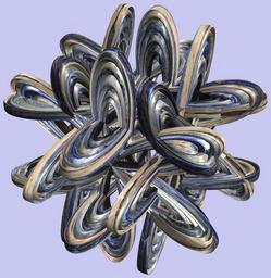 | Keywords: mathematica 3d cg parametricplot3d texture torus code program algorithm プログラム コード アルゴリズム 輪環 りんかん ドーナツ どーなつ トーラス とーらす mapping テクスチャ マッピング 模様 もよう abstract 抽象 ちゅうしょう アブストラクト design pattern デザイン パターン graphic グラフィック グラフィクス structure 意匠 構造 symmetry 対称性 たいしょうせい シンメトリー 対称 たいしょう white background tangle motorcycle bike vehicle a = 10; (* center hole size of a torus *) b1 = 6;(* the number of angles *) b2 = 6;(* the number of waves *) c = 8; (* distance from the center of rotation *) d = 6; (* the number of tori *) h1 = 5; (* width of a torus *) h2 = 8; (* width of a torus *) SetOptions[ParametricPlot3D, PlotRange -> Full, Mesh -> None, Boxed -> False, Axes -> None, PlotPoints -> 500, ImageSize -> 3000, Background -> RGBColor[{200, 200, 240}/255], PlotStyle -> Directive[Specularity[White, 70], Texture[Import["D:/tmp/94.jpg"]]], TextureCoordinateFunction -> ({#4, #5 Pi} &), Lighting -> "Neutral"]; x = (a - h1 Cos[t] + h2 Sin[b1 s]) Cos[s + Pi/(2 b1)]; y = (a - h1 Cos[t] + h2 Sin[b1 s]) Sin[s + Pi/(2 b1)]; z = Sin[b2 t] + c; vc = {{0, 0, 1}, {0, 0, -1}, {0, 1, 0}, {0, -1, 0}, {1, 0, 0}, {-1, 0, 0}}; rm = Table[{x, y, z}.RotationMatrix[{{0, 0, 1}, vc[[i]]}], {i, d}]; ParametricPlot3D[rm, {t, 0, 2 Pi}, {s, 0, 2 Pi}] (*--- The Texture *) a = 10; (* center hole size of a torus *) b1 = 6;(* the number of angles *) b2 = 6;(* the number of waves *) c = 8; (* distance from the center of rotation *) d = 6; (* the number of tori *) h1 = 5; (* width of a torus *) h2 = 8; (* width of a torus *) SetOptions[ParametricPlot3D, PlotRange -> Full, Mesh -> None, Boxed -> False, Axes -> None, PlotPoints -> 500, ImageSize -> 3000, Background -> RGBColor[{200, 200, 240}/255], PlotStyle -> Directive[Specularity[White, 70], Texture[Import["D:/tmp/94.jpg"]]], TextureCoordinateFunction -> ({#4, #5 Pi} &), Lighting -> "Neutral"]; x = (a - h1 Cos[t] + h2 Sin[b1 s]) Cos[s + Pi/(2 b1)]; y = (a - h1 Cos[t] + h2 Sin[b1 s]) Sin[s + Pi/(2 b1)]; z = Sin[b2 t] + c; vc = {{0, 0, 1}, {0, 0, -1}, {0, 1, 0}, {0, -1, 0}, {1, 0, 0}, {-1, 0, 0}}; rm = Table[{x, y, z}.RotationMatrix[{{0, 0, 1}, vc[[i]]}], {i, d}]; ParametricPlot3D[rm, {t, 0, 2 Pi}, {s, 0, 2 Pi}] (*--- The Texture *) |