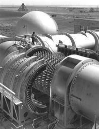 | Keywords: blackandwhite monochrome black and white (A-14376): The rotor of the 6- x 6-Foot Supersonic Wind Tunnel’s eight-stage axial compressor is visible with the case opened. Note the stator blades mounted inside the case. These fit between the rows of rotor blades. (A-14376): The rotor of the 6- x 6-Foot Supersonic Wind Tunnel’s eight-stage axial compressor is visible with the case opened. Note the stator blades mounted inside the case. These fit between the rows of rotor blades. | ||||
