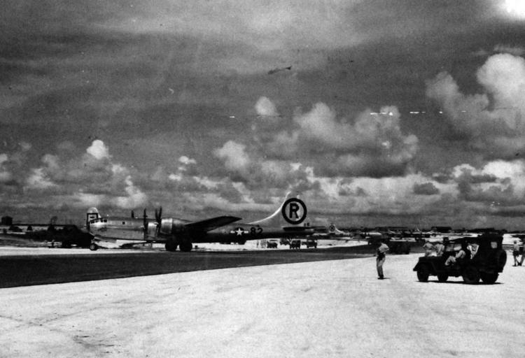 | Keywords: blackandwhite monochrome outdoor black and white 77-BT-91: Tinian Island, August 1945. Boeing B-29 Superfortress, Enola Gay, returns home after strike at Hiroshima, August 6, 1945, entering hard sand. (8/25/2015). 77-BT-91: Tinian Island, August 1945. Boeing B-29 Superfortress, Enola Gay, returns home after strike at Hiroshima, August 6, 1945, entering hard sand. (8/25/2015). |