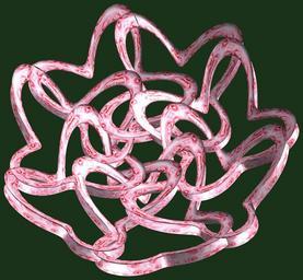 | Keywords: mathematica 3d cg parametricplot3d texture torus 輪環 りんかん ドーナツ どーなつ 四芒星 しぼうせい 四光星 しこうせい 四稜星 しりょうせい code program algorithm コード プログラム アルゴリズム geometric sculpture geometricsculpture shape geometry sculpture mapping テクスチャ マッピング 模様 もよう abstract 抽象 ちゅうしょう アブストラクト design pattern デザイン パターン graphic グラフィック グラフィクス structure 意匠 構造 symmetry 対称性 たいしょうせい シンメトリー 対称 たいしょう algorithm コード tangle outdoor black background a = 3; (* center hole size of a torus *) b = 4; (* tetra-torus *) c = 3; (* distance from the center of rotation *) d = 7; (* number of torus *) h = 1; (* height of a torus *) SetOptions[ParametricPlot3D, PlotRange -> Full, Mesh -> None, Boxed -> False, Axes -> False, PlotPoints -> 400, ImageSize -> 3000, Background -> RGBColor[{25, 50, 25}/255], PlotStyle -> Directive[Specularity[White, 30], Texture[Import["D:/tmp/86.jpg"]]], TextureCoordinateFunction -> ({#4, #5 2 Pi} &), Lighting -> "Neutral"]; f[v_] := Cos[2 Cos[Cos[Cos[v]]]]; x = (a - f[t] - Sin[b s]) Cos[s + 3 Pi/(4 b)] + c; y = (a - f[t] - Sin[b s]) Sin[s + 3 Pi/(4 b)] + c; z = (a - Sin[t/2] - h Sin[b s]); rot = Table[{x, y, z}.RotationMatrix[2 i Pi/d, {1, 1, 6}], {i, d}]; ParametricPlot3D[rot, {t, 0, 2 Pi}, {s, 0, 2 Pi}] (*--- The Texture *) a = 3; (* center hole size of a torus *) b = 4; (* tetra-torus *) c = 3; (* distance from the center of rotation *) d = 7; (* number of torus *) h = 1; (* height of a torus *) SetOptions[ParametricPlot3D, PlotRange -> Full, Mesh -> None, Boxed -> False, Axes -> False, PlotPoints -> 400, ImageSize -> 3000, Background -> RGBColor[{25, 50, 25}/255], PlotStyle -> Directive[Specularity[White, 30], Texture[Import["D:/tmp/86.jpg"]]], TextureCoordinateFunction -> ({#4, #5 2 Pi} &), Lighting -> "Neutral"]; f[v_] := Cos[2 Cos[Cos[Cos[v]]]]; x = (a - f[t] - Sin[b s]) Cos[s + 3 Pi/(4 b)] + c; y = (a - f[t] - Sin[b s]) Sin[s + 3 Pi/(4 b)] + c; z = (a - Sin[t/2] - h Sin[b s]); rot = Table[{x, y, z}.RotationMatrix[2 i Pi/d, {1, 1, 6}], {i, d}]; ParametricPlot3D[rot, {t, 0, 2 Pi}, {s, 0, 2 Pi}] (*--- The Texture *) |
