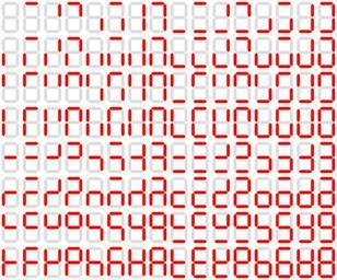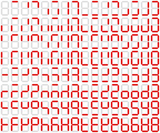 | Keywords: 7-segment.svg Seven-segment display Segments right 160px <table border 1 cellspacing 0 cellpadding 6 style background f8f8ff; border 1px solid 88a; border-collapse collapse; margin 0 0 0 2em; padding 6px > <tr> <td>a</td><td>top</td> </tr> <td>b</td><td>top right</td> </tr> <td>c</td><td>bottom right </td> </tr> <td>d</td><td>bottom</td> </tr> <td>e</td><td>bottom left</td> </tr> <td>f</td><td>top left</td> </tr> <td>g</td><td>middle</td> </tr> </table> 2010-04-05 85987 1735 7 c t <br> InvalidSVG https //upload wikimedia org/wikipedia/commons/archive/d/d1/20120216080631 217-segment svg ss 1 130 ---- The following table shows also all of the 128 possible segment combination pictures <br> The ten numbers are bordered the possible characters AbCcdEFGHhiJjLlnoPrtUuY are shown at mouse pointing wikitable 40px 40px 40px 40px 40px 40px 40px border 1 40px border 7 40px 40px 40px 40px 40px 40px j 40px 40px - 40px 40px 40px 40px 40px 40px 40px 40px 40px 40px <nowiki/>i 40px 40px 40px <nowiki/>u 40px 40px J 40px - 40px 40px 40px 40px 40px 40px 40px 40px 40px 40px 40px 40px 40px 40px 40px 40px - 40px <nowiki>l</nowiki> 40px 40px 40px 40px 40px 40px 40px 40px L 40px C 40px 40px 40px 40px G 40px U 40px border 0 - 40px 40px 40px 40px 40px 40px 40px 40px 40px 40px 40px 40px 40px 40px 40px 40px border 3 - 40px <nowiki>r</nowiki> 40px 40px 40px 40px <nowiki>n</nowiki> 40px 40px 40px 40px <nowiki>c</nowiki> 40px 40px 40px border 2 40px <nowiki>o</nowiki> 40px 40px <nowiki>d</nowiki> 40px - 40px 40px 40px 40px 40px 40px 40px border 4 40px 40px 40px 40px 40px 40px 40px border 5 40px <nowiki>Y</nowiki> 40px border 9 - 40px 40px F 40px 40px P 40px <nowiki>h</nowiki> 40px 40px H 40px A 40px <nowiki>t</nowiki> 40px E 40px 40px 40px <nowiki>b</nowiki> 40px border 6 40px 40px border 8 Red seven segment display illustrations |