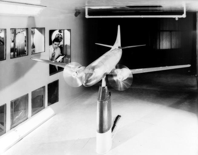 | Keywords: blackandwhite monochrome black and white (L-75503.01): In this view a pylon mounted on the balance below the floor of the 7 x 10-Foot LSWT supports a powered model of a Martin 404 airliner under test. (L-75503.01): In this view a pylon mounted on the balance below the floor of the 7 x 10-Foot LSWT supports a powered model of a Martin 404 airliner under test. |