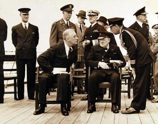 Keywords: 80-G-26876: Atlantic Charter, August 1941. Informal group photograph including President Franklin D. Roosevelt and Prime Minister Winston S. Churchill on deck of HMS Prince of Wales during church services during the Atlantic Charter. Seated with Prime Minister Winston S. Churchill on the deck of the battleship is President Roosevelt who is leaning towards a Royal Navy aide for a brief conversation. Behind the President is General George S. Marshall, U.S. Army Chief of Staff, behind Churchill; Admiral Harold R. Stark, Commander of U.S. Naval Operations in European waters. Photograph released August 1941. U.S. Navy Photograph, now in the collections of the National Archives. (2016/03/22). 80-G-26876: Atlantic Charter, August 1941. Informal group photograph including President Franklin D. Roosevelt and Prime Minister Winston S. Churchill on deck of HMS Prince of Wales during church services during the Atlantic Charter. Seated with Prime Minister Winston S. Churchill on the deck of the battleship is President Roosevelt who is leaning towards a Royal Navy aide for a brief conversation. Behind the President is General George S. Marshall, U.S. Army Chief of Staff, behind Churchill; Admiral Harold R. Stark, Commander of U.S. Naval Operations in European waters. Photograph released August 1941. U.S. Navy Photograph, now in the collections of the National Archives. (2016/03/22).