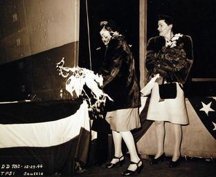 | Keywords: 80-G-299255: Mrs. David S. Folsom, Sponsor of USS Rowan (DD 782) during the destroyer’s christening at Todd Pacific Shipyards, Inc., Seattle, Washington, December 29, 1944. Mrs. Folsom was the great-grandniece Vice Admiral Stephen C. Rowan. A veteran of Korea and Vietnam, Rowan eventually ran around and was wrecked while under tow in August 22, 1977. She was later salvaged for parts. U.S. Navy photograph, now in the collections of the National Archives. (2015/12/15). 80-G-299255: Mrs. David S. Folsom, Sponsor of USS Rowan (DD 782) during the destroyer’s christening at Todd Pacific Shipyards, Inc., Seattle, Washington, December 29, 1944. Mrs. Folsom was the great-grandniece Vice Admiral Stephen C. Rowan. A veteran of Korea and Vietnam, Rowan eventually ran around and was wrecked while under tow in August 22, 1977. She was later salvaged for parts. U.S. Navy photograph, now in the collections of the National Archives. (2015/12/15). |