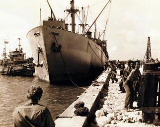 | Keywords: outdoor vehicle 80-G-349316: SS Sylvester Pattie, Liberty Ship, was the first large American vessel docked at Okinawa since the April 1st invasion. It was docked at a new fire proof fuel pier which had just been completed by the 7th Seabees in Buckner Bay, off Katchin Hanto, Okinawa. Shown: Navy Seabees in the right foreground were about to secure a line to the three-pile mooring ballard immediately in front of them. Aft, a similar line was secured to 19-pile dolphin (mooring post) just off the outer end of the pier. In the background, across the pier from the ship, a pile driver may be seen. It had finished its final work, for this pier, in driving the piles for the dolphin. Note USS YTB 229. Photograph released October 22, 1945. U.S. Navy photograph, now in the collections of the National Archives. (2015/12/22) 80-G-349316: SS Sylvester Pattie, Liberty Ship, was the first large American vessel docked at Okinawa since the April 1st invasion. It was docked at a new fire proof fuel pier which had just been completed by the 7th Seabees in Buckner Bay, off Katchin Hanto, Okinawa. Shown: Navy Seabees in the right foreground were about to secure a line to the three-pile mooring ballard immediately in front of them. Aft, a similar line was secured to 19-pile dolphin (mooring post) just off the outer end of the pier. In the background, across the pier from the ship, a pile driver may be seen. It had finished its final work, for this pier, in driving the piles for the dolphin. Note USS YTB 229. Photograph released October 22, 1945. U.S. Navy photograph, now in the collections of the National Archives. (2015/12/22) |