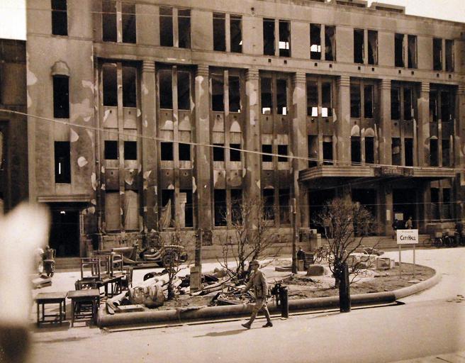 Keywords: architecture building 80-G-354618: Atomic Bomb Damage to Hiroshima, as seen by USS Appalachian (AGC-1). The City Hall. Photographed by PhoM3/C George Almarez. Photographed received October 26, 1945. U.S. Navy photograph, now in the collections of the National Archives. (2016/06/21). 80-G-354618: Atomic Bomb Damage to Hiroshima, as seen by USS Appalachian (AGC-1). The City Hall. Photographed by PhoM3/C George Almarez. Photographed received October 26, 1945. U.S. Navy photograph, now in the collections of the National Archives. (2016/06/21). |