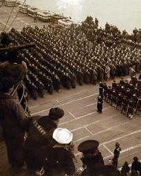 | Keywords: 80-G-354635: British tribute to USS Enterprise (CV 6), hero ship of the Pacific war, was paid by the British Board of Admiralty during her initial visit to Europe when she arrived in Southampton to carry 4,500 European veterans homeward as one of the 15 “Magic Carpet” vessels operating in the Atlantic. During ceremonial visit of the Board of Admiralty, A.V. Alexander, First Lord of the Admiralty, in an unprecedented ceremony presented the “Big E” with the Admiralty Flag. Shown: One thousand troops being transported to the States, along with members of the crew, stand in formation on flight deck. Photographed received November 23, 1945. U.S. Navy photograph, now in the collections of the National Archives. (2016/06/21). 80-G-354635: British tribute to USS Enterprise (CV 6), hero ship of the Pacific war, was paid by the British Board of Admiralty during her initial visit to Europe when she arrived in Southampton to carry 4,500 European veterans homeward as one of the 15 “Magic Carpet” vessels operating in the Atlantic. During ceremonial visit of the Board of Admiralty, A.V. Alexander, First Lord of the Admiralty, in an unprecedented ceremony presented the “Big E” with the Admiralty Flag. Shown: One thousand troops being transported to the States, along with members of the crew, stand in formation on flight deck. Photographed received November 23, 1945. U.S. Navy photograph, now in the collections of the National Archives. (2016/06/21). |