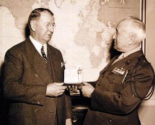 Keywords: people indoor monochrome 80-G-41010: The Oscar plaques awarded to the U.S. Navy by the Motion Picture Academy of Arts and Sciences for the Official Navy film “Battle of Midway”, which was produced by Commandeer John Ford, USNR. Shown: Brigadier General R.L. Denig, (right), Public Relations Officer of the U.S. Marine Corps, who received the award in the name of the Navy, Marines, and Coast Guard at the annual dinner of the Academy in Los Angeles, California, on March 4, is shown delivering the statuette to the Secretary of the Navy at the Navy Department, Washington, April 1, 1943. Photograph released April 2, 1943. Official U.S. Navy Photograph, now in the collections of the National Archives. (2016/12/20). 80-G-41010: The Oscar plaques awarded to the U.S. Navy by the Motion Picture Academy of Arts and Sciences for the Official Navy film “Battle of Midway”, which was produced by Commandeer John Ford, USNR. Shown: Brigadier General R.L. Denig, (right), Public Relations Officer of the U.S. Marine Corps, who received the award in the name of the Navy, Marines, and Coast Guard at the annual dinner of the Academy in Los Angeles, California, on March 4, is shown delivering the statuette to the Secretary of the Navy at the Navy Department, Washington, April 1, 1943. Photograph released April 2, 1943. Official U.S. Navy Photograph, now in the collections of the National Archives. (2016/12/20).