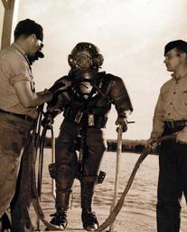 | Keywords: people 80-G-707443: Deep Sea Diving School, Naval Gun Factory, Washington, D.C. The standard Navy deep sea diver’s dress and equipment for diving-on-air weighs approximately 190 pounds. The weight is distributed as follows: Helmet 53lbs; Shoes 35lbs; lead-weighted belt 83lbs, rubberized waterproof suit, 18 lbs, released February 3, 1950. U.S. Navy Photograph, now in the collections of the National Archives. (2016/06/14). 80-G-707443: Deep Sea Diving School, Naval Gun Factory, Washington, D.C. The standard Navy deep sea diver’s dress and equipment for diving-on-air weighs approximately 190 pounds. The weight is distributed as follows: Helmet 53lbs; Shoes 35lbs; lead-weighted belt 83lbs, rubberized waterproof suit, 18 lbs, released February 3, 1950. U.S. Navy Photograph, now in the collections of the National Archives. (2016/06/14). |