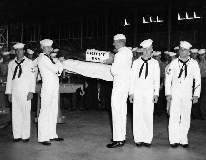 MAKE A MEME View Large Image Naval Air Station, Banana River, Florida, September 7, 1943. Funeral services for the mascot of Hedron 12. “Skippy” encased in empty bomb shell is placed on carrier to be hauled to plane. Official U.S. Navy photograph, now in the ...