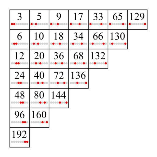 | Keywords: 8 choose 2 array.svg Little-endian Array of the <math>\tbinom 8 2 </math> 28 2-element subsets of an 8-element set With the binary vectors interpreted as reverse binary numbers this is A018900 as a square array own mate2code 250px Triangular 8 choose 2 arrays Binary numeral system |