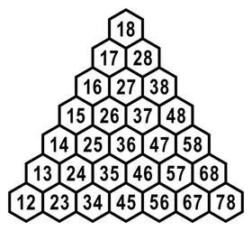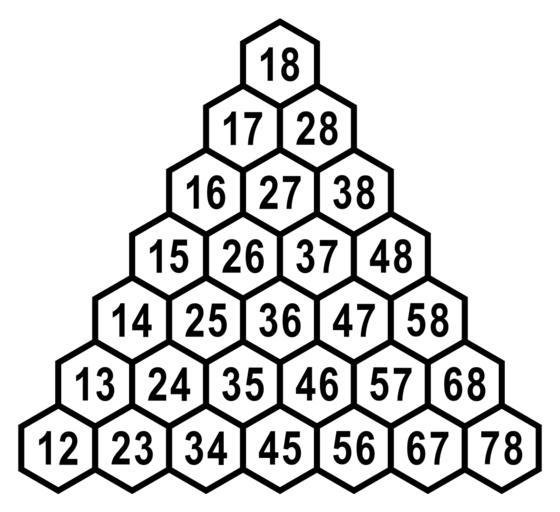 Keywords: 8 choose 2 array, hexagonal; pairs.svg Array of the <math>\tbinom 8 2 </math> 28 2-element subsets of an 8-element set own mate2code 250px Triangular 8 choose 2 arrays