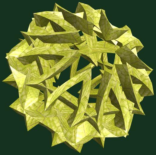 | Keywords: mathematica 3d cg parametricplot3d texture torus code program algorithm プログラム コード アルゴリズム 輪環 りんかん ドーナツ どーなつ 六芒星 ろくぼうせい geometric sculpture geometricsculpture shape geometry sculpture mapping テクスチャ マッピング 模様 もよう abstract 抽象 ちゅうしょう アブストラクト design pattern デザイン パターン graphic グラフィック グラフィクス structure 意匠 構造 symmetry 対称性 たいしょうせい シンメトリー 対称 たいしょう leaf plant foliage organic pattern outdoor tree black background a = 4; (* center hole size *) b = 6; (* hexa-torus *) c = -9; (* distance from the center of rotation *) d = 8; (* number of torus *) h = 2; (* height of a torus *) SetOptions[ParametricPlot3D, PlotRange -> Full, Mesh -> None, Boxed -> False, Axes -> False, PlotPoints -> 400, ImageSize -> 3000, Background -> RGBColor[{20, 50, 30}/255], PlotStyle -> Directive[Specularity[White, 30], Texture[Import["D:/tmp/71.jpg"]]], TextureCoordinateFunction -> ({#4, #5 Pi} &), Lighting -> "Neutral"]; f[v_] := TriangleWave[{-1, 1}, v/(2 Pi)]; g[v_] := TriangleWave[{-1, 1}, v/(2 Pi) + 1/4]; x = (a - g[t] - f[b s]) Cos[s]; y = (a - g[t] - f[b s]) Sin[s]; z = (a - f[t] - h f[b s]) + c; rm = Table[{x, y, z}.RotationMatrix[2 i Pi/d, {1, 1, 0}], {i, d}]; ParametricPlot3D[rm, {t, 0, 2 Pi}, {s, 0, Pi}] (*--- The Texture *) a = 4; (* center hole size *) b = 6; (* hexa-torus *) c = -9; (* distance from the center of rotation *) d = 8; (* number of torus *) h = 2; (* height of a torus *) SetOptions[ParametricPlot3D, PlotRange -> Full, Mesh -> None, Boxed -> False, Axes -> False, PlotPoints -> 400, ImageSize -> 3000, Background -> RGBColor[{20, 50, 30}/255], PlotStyle -> Directive[Specularity[White, 30], Texture[Import["D:/tmp/71.jpg"]]], TextureCoordinateFunction -> ({#4, #5 Pi} &), Lighting -> "Neutral"]; f[v_] := TriangleWave[{-1, 1}, v/(2 Pi)]; g[v_] := TriangleWave[{-1, 1}, v/(2 Pi) + 1/4]; x = (a - g[t] - f[b s]) Cos[s]; y = (a - g[t] - f[b s]) Sin[s]; z = (a - f[t] - h f[b s]) + c; rm = Table[{x, y, z}.RotationMatrix[2 i Pi/d, {1, 1, 0}], {i, d}]; ParametricPlot3D[rm, {t, 0, 2 Pi}, {s, 0, Pi}] (*--- The Texture *) |