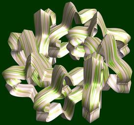| Keywords: mathematica 3d cg parametricplot3d texture torus 輪環 りんかん ドーナツ どーなつ 六芒星 ろくぼうせい 六光星 ろくこうせい 六稜星 ろくりょうせい program プログラム code コード algorithm コード アルゴリズム hexagram geometric sculpture geometricsculpture shape geometry sculpture mapping テクスチャ マッピング 模様 もよう design pattern デザイン パターン graphic グラフィック グラフィクス structure 意匠 構造 symmetry 対称性 たいしょうせい シンメトリー 対称 たいしょう algorithm black background organic pattern pastel photo border SetOptions[ParametricPlot3D, PlotRange -> Full, Mesh -> None, Boxed -> False, Axes -> None, PlotPoints -> 400, ImageSize -> 3000, Background -> Darker[Green, 0.8], PlotStyle -> Directive[Specularity[White, 30], Texture[Import["D:/tmp/862.jpg"]]], TextureCoordinateFunction -> ({#4 + #5, #5/Pi} &), Lighting -> "Neutral"]; a = 4; (* center hole size of a torus *) b = 6; (* hexa-torus *) c = 3.5; (* distance from the center of rotation *) d = 8; (* number of torus *) f[v_] := TriangleWave[{-1, 1}, v/(2 Pi)]; g[v_] := TriangleWave[{-1, 1}, v/(2 Pi) + 1/4]; x = (a - g[t] - Sin[b s]) g[s + Pi/(2 b)] + c; y = f[t] + c; z = (a - g[t] - Sin[b s]) f[s + Pi/(2 b)] + c; rot = Table[{x, y, z}.RotationMatrix[2 i Pi/d, {1, 0, 0}], {i, d}]; ParametricPlot3D[rot, {t, 0, 2 Pi}, {s, 0, 2 Pi}] (* --- The Texture is another color version of this: www.flickr.com/photos/tanaka_juuyoh/5412528282 *) SetOptions[ParametricPlot3D, PlotRange -> Full, Mesh -> None, Boxed -> False, Axes -> None, PlotPoints -> 400, ImageSize -> 3000, Background -> Darker[Green, 0.8], PlotStyle -> Directive[Specularity[White, 30], Texture[Import["D:/tmp/862.jpg"]]], TextureCoordinateFunction -> ({#4 + #5, #5/Pi} &), Lighting -> "Neutral"]; a = 4; (* center hole size of a torus *) b = 6; (* hexa-torus *) c = 3.5; (* distance from the center of rotation *) d = 8; (* number of torus *) f[v_] := TriangleWave[{-1, 1}, v/(2 Pi)]; g[v_] := TriangleWave[{-1, 1}, v/(2 Pi) + 1/4]; x = (a - g[t] - Sin[b s]) g[s + Pi/(2 b)] + c; y = f[t] + c; z = (a - g[t] - Sin[b s]) f[s + Pi/(2 b)] + c; rot = Table[{x, y, z}.RotationMatrix[2 i Pi/d, {1, 0, 0}], {i, d}]; ParametricPlot3D[rot, {t, 0, 2 Pi}, {s, 0, 2 Pi}] (* --- The Texture is another color version of this: www.flickr.com/photos/tanaka_juuyoh/5412528282 *) |