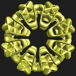 | Keywords: mathematica 3d cg parametricplot3d texture torus 輪環 りんかん ドーナツ どーなつ 八芒星 はちぼうせい 八光星 はちこうせい 八稜星 はちりょうせい code program algorithm コード プログラム アルゴリズム geometric sculpture geometricsculpture shape geometry sculpture mapping テクスチャ マッピング 模様 もよう abstract 抽象 ちゅうしょう アブストラクト design pattern デザイン パターン graphic グラフィック グラフィクス structure 意匠 構造 symmetry 対称性 たいしょうせい シンメトリー 対称 たいしょう algorithm コード black background organic pattern indoor a = 10; (* center hole size of a torus *) b = 8; (* octa-torus *) c = -18; (* distance from the center of rotation *) d = 8; (* number of torus *) h = 3; (* height of a torus *) SetOptions[ParametricPlot3D, PlotRange -> Full, Mesh -> None, Boxed -> False, Axes -> False, PlotPoints -> 400, ImageSize -> 3000, Background -> RGBColor[{30, 30, 30}/255], PlotStyle -> Directive[Specularity[White, 30], Texture[Import["D:/tmp/71.jpg"]]], TextureCoordinateFunction -> ({#4 + #5, #5/Pi} &), Lighting -> "Neutral"]; f[v_] := Sin[2 Sin[Sin[Sin[v]]]]; x = (a - Cos[t] - f[b s]) Cos[s + Pi/(2 b)]; y = (a - Cos[t] - f[b s]) Sin[s + Pi/(2 b)]; z = (a - Sin[t] - h f[b s]) + c; rm = Table[{x, y, z}.RotationMatrix[2 i Pi/d, {1, 0, 0}], {i, d}]; ParametricPlot3D[rm, {t, 0, 2 Pi}, {s, 0, 2 Pi}] (*--- The Texture *) a = 10; (* center hole size of a torus *) b = 8; (* octa-torus *) c = -18; (* distance from the center of rotation *) d = 8; (* number of torus *) h = 3; (* height of a torus *) SetOptions[ParametricPlot3D, PlotRange -> Full, Mesh -> None, Boxed -> False, Axes -> False, PlotPoints -> 400, ImageSize -> 3000, Background -> RGBColor[{30, 30, 30}/255], PlotStyle -> Directive[Specularity[White, 30], Texture[Import["D:/tmp/71.jpg"]]], TextureCoordinateFunction -> ({#4 + #5, #5/Pi} &), Lighting -> "Neutral"]; f[v_] := Sin[2 Sin[Sin[Sin[v]]]]; x = (a - Cos[t] - f[b s]) Cos[s + Pi/(2 b)]; y = (a - Cos[t] - f[b s]) Sin[s + Pi/(2 b)]; z = (a - Sin[t] - h f[b s]) + c; rm = Table[{x, y, z}.RotationMatrix[2 i Pi/d, {1, 0, 0}], {i, d}]; ParametricPlot3D[rm, {t, 0, 2 Pi}, {s, 0, 2 Pi}] (*--- The Texture *) |