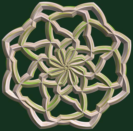 Keywords: mathematica 3d cg parametricplot3d texture torus code program algorithm プログラム コード アルゴリズム 輪環 りんかん ドーナツ どーなつ 五芒星 ごぼうせい geometric sculpture geometricsculpture shape geometry sculpture mapping テクスチャ マッピング 模様 もよう abstract 抽象 ちゅうしょう アブストラクト design pattern デザイン パターン graphic グラフィック グラフィクス structure 意匠 構造 symmetry 対称性 たいしょうせい シンメトリー 対称 たいしょう tangle pastel organic pattern a = 8; (* center hole size *) b = 5; (* penta-torus *) c = 5; (* distance from the center of rotation *) d = 8; (* number of torus *) h = 0; (* height of a torus *) SetOptions[ParametricPlot3D, PlotRange -> Full, Mesh -> None, Boxed -> False, Axes -> False, PlotPoints -> 400, ImageSize -> 3000, Background -> RGBColor[{20, 50, 30}/255], PlotStyle -> Directive[Specularity[White, 70], Texture[Import["D:/tmp/862.jpg"]]], TextureCoordinateFunction -> ({#4 + #5, #5 / Pi} &), Lighting -> "Neutral"]; f[v_] := TriangleWave[{-1, 1}, v/(2 Pi)]; g[v_] := TriangleWave[{-1, 1}, v/(2 Pi) + 1/4]; x = (a - g[t] - f[b s]) Cos[s] + c; y = (a - g[t] - f[b s]) Sin[s] + c; z = (a - f[t] - h f[b s]); rm = Table[{x, y, z}.RotationMatrix[2 i Pi/d, {0, 0, 1}], {i, d}]; ParametricPlot3D[rm, {t, 0, 2 Pi}, {s, 0, Pi}] (*--- The Texture *) a = 8; (* center hole size *) b = 5; (* penta-torus *) c = 5; (* distance from the center of rotation *) d = 8; (* number of torus *) h = 0; (* height of a torus *) SetOptions[ParametricPlot3D, PlotRange -> Full, Mesh -> None, Boxed -> False, Axes -> False, PlotPoints -> 400, ImageSize -> 3000, Background -> RGBColor[{20, 50, 30}/255], PlotStyle -> Directive[Specularity[White, 70], Texture[Import["D:/tmp/862.jpg"]]], TextureCoordinateFunction -> ({#4 + #5, #5 / Pi} &), Lighting -> "Neutral"]; f[v_] := TriangleWave[{-1, 1}, v/(2 Pi)]; g[v_] := TriangleWave[{-1, 1}, v/(2 Pi) + 1/4]; x = (a - g[t] - f[b s]) Cos[s] + c; y = (a - g[t] - f[b s]) Sin[s] + c; z = (a - f[t] - h f[b s]); rm = Table[{x, y, z}.RotationMatrix[2 i Pi/d, {0, 0, 1}], {i, d}]; ParametricPlot3D[rm, {t, 0, 2 Pi}, {s, 0, Pi}] (*--- The Texture *)