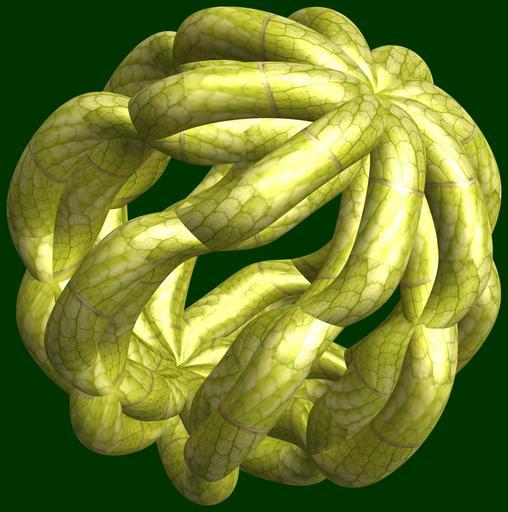 | Keywords: mathematica 3d cg parametricplot3d texture torus 輪環 りんかん ドーナツ どーなつ 三芒星 さんぼうせい 三光星 さんこうせい 三稜星 さんりょうせい code program algorithm コード プログラム アルゴリズム geometric sculpture geometricsculpture shape geometry sculpture mapping テクスチャ マッピング 模様 もよう abstract 抽象 ちゅうしょう アブストラクト design pattern デザイン パターン graphic グラフィック グラフィクス structure 意匠 構造 symmetry 対称性 たいしょうせい シンメトリー 対称 たいしょう algorithm コード black background organic pattern foliage plant a = 8; (* center hole size of a torus *) b = 3; (* tri-torus *) c = -8; (* distance from the center of rotation *) d = 8; (* number of torus *) h = 1; (* height of a torus *) SetOptions[ParametricPlot3D, PlotRange -> Full, Mesh -> None, Boxed -> False, Axes -> False, PlotPoints -> 400, ImageSize -> 3000, Background -> Darker[Green, 0.8], PlotStyle -> Directive[Specularity[White, 30], Texture[Import["D:/tmp/71.jpg"]]], TextureCoordinateFunction -> ({#4, #5 b Pi} &), Lighting -> "Neutral"]; f[v_] := Sin[2 Sin[Sin[Sin[v]]]]; x = (a - Cos[t] - f[b s]) Cos[s + Pi/b]; y = (a - Cos[t] - f[b s]) Sin[s + Pi/b]; z = (a - Sin[t] - h f[b s]) + c; rm = Table[{x, y, z}.RotationMatrix[2 i Pi/d, {1, 0, 0}], {i, d}]; ParametricPlot3D[rm, {t, 0, 2 Pi}, {s, 0, 2 Pi}] (*--- The Texture *) a = 8; (* center hole size of a torus *) b = 3; (* tri-torus *) c = -8; (* distance from the center of rotation *) d = 8; (* number of torus *) h = 1; (* height of a torus *) SetOptions[ParametricPlot3D, PlotRange -> Full, Mesh -> None, Boxed -> False, Axes -> False, PlotPoints -> 400, ImageSize -> 3000, Background -> Darker[Green, 0.8], PlotStyle -> Directive[Specularity[White, 30], Texture[Import["D:/tmp/71.jpg"]]], TextureCoordinateFunction -> ({#4, #5 b Pi} &), Lighting -> "Neutral"]; f[v_] := Sin[2 Sin[Sin[Sin[v]]]]; x = (a - Cos[t] - f[b s]) Cos[s + Pi/b]; y = (a - Cos[t] - f[b s]) Sin[s + Pi/b]; z = (a - Sin[t] - h f[b s]) + c; rm = Table[{x, y, z}.RotationMatrix[2 i Pi/d, {1, 0, 0}], {i, d}]; ParametricPlot3D[rm, {t, 0, 2 Pi}, {s, 0, 2 Pi}] (*--- The Texture *) |