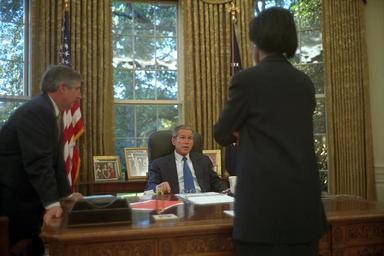 | Keywords: washington d.c. dc u.s. national archives usnationalarchives president george w. bush presidentgeorgewbush 9/11 911 nara:arcid=5997249 national security adviser nationalsecurityadviser condoleezza rice condoleezzarice president george w. bush georgewbush andy card andycard oval office ovaloffice white house whitehouse george w. bush presidential library georgewbushpresidentiallibrary indoor Original Caption: President George W. Bush meets with Andy Card and Condoleezza Rice in the Oval Office of the White House. U.S. National Archives’ Local Identifier: P7126-23 Created By: President (2001-2009 : Bush). Office of Management and Administration. Office of White House Management. Photography Office. (01/20/2001 - 01/20/2009) From: Photographs Related to the George W. Bush Administration, compiled 01/20/2001 - 01/20/2009 Production Dates: 09/12/2001 Persistent URL: arcweb.archives.gov/arc/action/ExternalIdSearch?id=5997249 Repository: George W. Bush Library (Lewisville, TX) Access Restrictions: Unrestricted Use Restrictions: Unrestricted Original Caption: President George W. Bush meets with Andy Card and Condoleezza Rice in the Oval Office of the White House. U.S. National Archives’ Local Identifier: P7126-23 Created By: President (2001-2009 : Bush). Office of Management and Administration. Office of White House Management. Photography Office. (01/20/2001 - 01/20/2009) From: Photographs Related to the George W. Bush Administration, compiled 01/20/2001 - 01/20/2009 Production Dates: 09/12/2001 Persistent URL: arcweb.archives.gov/arc/action/ExternalIdSearch?id=5997249 Repository: George W. Bush Library (Lewisville, TX) Access Restrictions: Unrestricted Use Restrictions: Unrestricted |