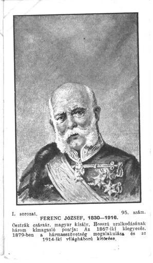 | Keywords: 95. Ferenc József.jpg hu A felvétel szkennelés 2012 június 7 én készült A képeslapsorozat korábbi tulajdonosa Bálint János Ócsa volt Az I sor 1 sz 1 sorozat 100 szám jelzetű képeslapok a 101 jelzetű füst albumot töltötték meg A képeslap sorozat képeit az 1920 as években adták ki Az ismeretlen szerző halála óta több mint 70 év telt el A képeslapok hátoldalán ex libris A sorozat képei 1 sz Gróf Széchenyi István 1791 1860 2 sz Deák Ferenc 1803 1876 2 sz 3 sz 4 sz 5 sz 6 sz 7 sz Felsőbükki Nagy Pál 1777 1857 8 sz Báró Eötvös József 1813 1871 9 sz Kossuth Lajos 1802 1894 10 sz Petőfi Sándor 1823 1849 11 sz Liszt Ferenc 1811 1886 12 sz Batthányy Lajos gróf 1806 1849 13 sz II Lajos 1506 1526 14 sz Munkácsy Mihály 1844 1900 15 sz Tisza Kálmán gróf 1830 1902 16 sz Mátyás király 1440 1490 17 sz Arany János 1817 1882 18 sz Tisza István gróf 1865 1918 19 sz Kölcsey Ferenc 1790 1838 20 sz Szinyei Merse Pál 1845 1920 21 sz Jókai Mór 1825 1904 22 sz Mikszáth Kálmán 1849 1910 23 sz Vörösmarty Mihály 1800 1855 24 sz Fadrusz János 1858 1903 25 sz Árpád a Honalapító 26 sz Szent István 975 -1038 27 sz Szent László 1040 - 1095 28 sz Könyves Kálmán 1070 1116 29 sz II Endre 1205 1235 30 sz IV Béla 1206 1270 31 sz Nagy Lajos 32 sz Hunyadi János 33 sz II Rákóczi Ferenc 34 sz Vak Bottyán 35 sz III Károly 36 sz II József 37 sz Madách Imre 38 sz Katona József 39 sz Csokonai Vitéz Mihály 40 sz Lotz Károly 41 sz Pöltenberg Ernő 42 sz Török Ignác 43 sz 44 sz 45 sz 46 sz 47 sz Aulich Lajos 48 sz Damjanich János 49 sz Dessewffy Arisztid 50 sz Lázár Vilmos 51 sz Kiss Ernő 52 sz Schweidel József 53 sz Vécsey Károly 54 sz Táncsics Mihály 55 sz Tompa Mihály 56 sz Rottenbiller Lipót 57 sz Szent Gellért 58 sz Szent Imre 59 sz Kapisztrán János 60 sz Kinizsi Pál 61 sz Tomori Pál 62 sz Zrinyi Miklós 63 sz Gábor Áron 64 sz Bem József 65 sz Bocskay István 66 sz Bethlen Gábor 67 sz József nádor 68 sz Kisfaludy Károly 69 sz Berzsenyi Dániel 70 sz Fáy András 71 sz Semmelweis Ignác 72 sz Egressy Gábor 73 sz Erkel Ferenc 74 sz Szilágyi Dezső 75 sz báró Bánffy Dezső 76 sz Ujházi Ede 77 sz Baross Gábor 78 sz id Wekerle Sándor 79 sz Justh Gyula 80 sz Prohászka Ottokár 81 sz Reményi Ede 82 sz Vámbéry Ármin 83 sz Rákosi Jenő 84 sz Eötvös Károly 85 sz Benczur Gyula 86 sz Blaha Lujza 87 sz Jászai Mari 88 sz Gárdonyi Géza 89 sz Ady Endre 90 sz Gyóni Géza 91 sz Báthori Zsigmond 92 sz Pázmány Péter 93 sz Kisfaludy Sándor 94 sz Goldmark Károly 95 sz Ferenc József 96 sz Erzsébet 97 sz Hermann Ottó 98 sz Lechner Ödön 99 sz Pósa Lajos 100 sz Móra Ferenc 101 jelzet füst album A felvétel és az egész sorozat képei megjelentek Creative Commons alatt a Metapolisz DVD sorozatban 2012-06-07 saját tulajdon author Custom license marker 2012 06 07 PD-old Metapolisz Uploaded with UploadWizard Franz Joseph I of Austria in art |