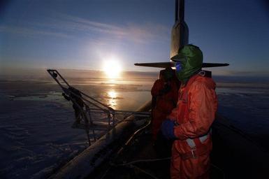 | Keywords: 961105-N-4482V-012 Arctic Submarine Mission.jpg en 961105-N-4482V-012 During an Arctic sunrise on board the U S Navy s attack submarine USS Pogy SSN 647 Jay Simpkins far left a scientist with the Oregon State University collects water samples while Navy Lieutenant Junior Grade Mark Cronley foreground stands watch as a safety observer on boats deck The second of five planned deployments through the year 2000 Pogy embarked a team of researchers led by Mr Ray Sambrotto of Columbia University During the several thousand mile trek the submarine collected data on the chemical biological and physical properties of the Arctic Ocean and conducted experiments in geophysics ice mechanics pollution detection and other areas For the purposes of this voyage a portion of the submarine s torpedo room was converted into laboratory space However at no time was the ship ever removed as a front-line warship U S Navy Photo by Photographer s Mate Second Class Steven H Vanderwerff Released 961105-N-4482V-012 Navy http //www navy mil/view_image asp id 425 U S Navy Photo by Photographer s Mate Second Class Steven H Vanderwerff PD-USGov-Military-Navy USS Pogy SSN-647 |