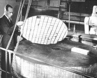 Keywords: astronomy space telescope observatory planets stars invention discovery sci-fi scifi black and white photograph blackandwhitephotograph equipment mirror 98 grubb parson grubbparson newcastle upon tyne newcastleupontyne mid 20th century mid20thcentury grubb parsons ltd collection grubbparsonsltdcollection england telescopic instruments telescopicinstruments manufacture early nineteenth century earlynineteenthcentury founded 1925 thomas grubb thomasgrubb sir charles parsons sircharlesparsons astronomical science study universe glass lantern slide glasslanternslide workshop walkergate observatories research suppliers rail chain man suit trousers jacket shirt tie crease shadow light attentive unsual pole floor wall interior parts circle glass design building construction standing hold demonstration metal steel debris grubb parsons ltd grubbparsonsltd science fiction sciencefiction blackandwhite monochrome black and white Reference: DS.GP.1919/3232 This photograph documents construction of Observatory equipment by Grubb Parsons in Newcastle upon Tyne at some point in the mid 20th century. This photograph is taken from the Grubb Parsons Ltd collection at Tyne & Wear Archives. The records of Grubb Parsons Ltd, Newcastle upon Tyne, England, consist of 65 linear metres (213 linear feet) of files, plans, photographs and glass plate negatives relating to this internationally renowned firm's manufacture of precision telescopic instruments. The original Business was founded in the early nineteenth century by Thomas Grubb, in 1925 the company was acquired by Sir Charles Parsons and continued to manufacture Telescopic and Astronomical instruments until 1985. This Glass Lantern Slide is taken from a large collection that documents the work of Grubb Parsons Ltd at their workshop in Walkergate, Newcastle upon Tyne. It was here that Grubb Parsons Ltd manufactured Telescopic and Astronomical equipment for companies and observatories world wide. Their equipment was designed and built for use and research across the Globe, to name only a few of these locations Grubb Parsons Ltd supplied to the UK, Switzerland, Denmark, Egypt, South Africa, Greece, Australia, Japan, India, Hawaii, Poland, Chile, Canada, France and Spain. (Copyright) We're happy for you to share these digital images within the spirit of The Commons. Please cite 'Tyne & Wear Archives & Museums' when reusing. Certain restrictions on high quality reproductions and commercial use of the original physical version apply though; if you're unsure please email archives@twmuseums.org.uk Reference: DS.GP.1919/3232 This photograph documents construction of Observatory equipment by Grubb Parsons in Newcastle upon Tyne at some point in the mid 20th century. This photograph is taken from the Grubb Parsons Ltd collection at Tyne & Wear Archives. The records of Grubb Parsons Ltd, Newcastle upon Tyne, England, consist of 65 linear metres (213 linear feet) of files, plans, photographs and glass plate negatives relating to this internationally renowned firm's manufacture of precision telescopic instruments. The original Business was founded in the early nineteenth century by Thomas Grubb, in 1925 the company was acquired by Sir Charles Parsons and continued to manufacture Telescopic and Astronomical instruments until 1985. This Glass Lantern Slide is taken from a large collection that documents the work of Grubb Parsons Ltd at their workshop in Walkergate, Newcastle upon Tyne. It was here that Grubb Parsons Ltd manufactured Telescopic and Astronomical equipment for companies and observatories world wide. Their equipment was designed and built for use and research across the Globe, to name only a few of these locations Grubb Parsons Ltd supplied to the UK, Switzerland, Denmark, Egypt, South Africa, Greece, Australia, Japan, India, Hawaii, Poland, Chile, Canada, France and Spain. (Copyright) We're happy for you to share these digital images within the spirit of The Commons. Please cite 'Tyne & Wear Archives & Museums' when reusing. Certain restrictions on high quality reproductions and commercial use of the original physical version apply though; if you're unsure please email archives@twmuseums.org.uk