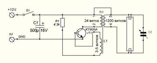 Keywords: 9-12 volts.JPG en 9 12V inverter for fluorescent bulb ru Питание люминесцентной лампы от 9-12 вольт Drawed by sPlan Dmitry G 2008-04-25 Low voltage power supplies for fluorescent lamps