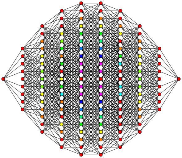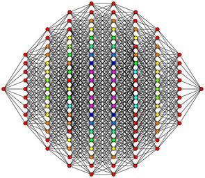 | Keywords: 9-cube column graph.svg 9-hypercube enneract graph This hypercube graph is an orthogonal projection This oriented projection shows columns of vertices positioned a vertex-edge-vertex distance from one vertex on the left to one vertex on the right and edges attaching adjacent columns of vertices The number of vertices in each column represents rows in Pascal's triangle being 1 9 36 84 126 126 84 36 9 1 in the case of a 9-cube Note Starting with the tesseract the orthogonal projection shows vertices overlapping The counts of vertices at each 2d location are represented by colors red orange yellow green etc own Geoff Richards Qef 2008-07-23 Old bitmap version en Image 9-cube column graph gif Source code See en User Qef/Orthographic hypercube diagrams Qef Hypercube graphs 9 2-fold rotational symmetry Geometry images with dihedral symmetry 02 |