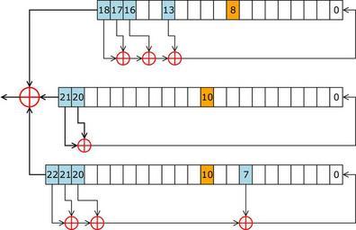 | Keywords: A5-1.png Schéma du A5/1 et ses trois registres à décalage Un registre est décalé si le bit en orange correspond à la majorité des trois bits oranges On insère alors un bit correspondant à un XOR entre les bits en bleu A5/1 stream cipher Original diagram for Wikipedia created with Dia Originally uploaded on the English Wikipedia by w User Matt Crypto at 21 22 17 October 2004 Matt Crypto A5-1_GSM_cipher svg Symmetric cipher diagrams Stream Cipher | ||||