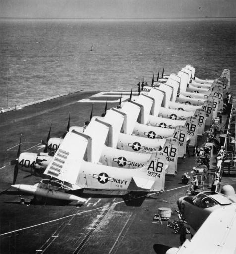 | Keywords: A-1s USS Forrestal CVA-59 1957.jpg en U S Navy Douglas AD Skyraider aircraft of Carrier Air Group One CVG-1 on the bow of the aircraft carrier USS Forrestal CVA-59 during the NATO Operation Strikeback some time between August and October 1957 The first seven planes are AD-6 of attack squadron VA-15 Valions tail code AB-4XX The next plane and the last three are AD-5Q of all weather attack squadron VA AW -33 DET 42 Night Hawks GD-8XX The fouth plane from the bow is an AD-5W from airborne early warning squadron VAW-12 DET 42 Bats GE-7XX In the foreground is an Douglas A3D-1 Skywarrior of heavy attack squadron VAH-1 Smokin' Tigers U S Navy National Museum of Naval Aviation photo No 1996 253 2303 http //collections naval aviation museum/emuwebdoncoms/pages/common/imagedisplay php irn 16006242 reftable ecatalogue refirn 16035199 1957 U S Navy PD-USGov-Military-Navy AD-5 A-1E Skyraider AD-6 A-1H Skyraider A-1 Skyraider in service with the United States Navy Aboard USS Forrestal CV-59 Attack Squadron 15 United States Navy Operation Strikeback Tactical Electronic Warfare Squadron 33 United States Navy |