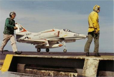 | Keywords: A-4F VA-164 CVA-19.jpg en A McDonnell Douglas A-4F Skyhawk aircraft of attack squadron VA-164 Ghost Riders Attack Carrier Air Wing 21 CVW-21 after having just returned from a bombing mission over Vietnam to the aircraft carrier USS Hancock CVA-19 in the early 1970s The flight deck crew member in the green shirt belongs to the catapult and arresting gear crews the one in the yellow shirt to the officers responsible for aircraft handling catapult and arresting gear or plane directing US Navy sailor or employee http //virtualcruisebooks com/v-web/gallery/Cruise-Photos-1970-1973 2C-by-Peter-Sakaris/A_4_2 1970-1973 Peter Sakaris PD-USGov-Military-Navy A-4F Skyhawk Attack Squadron 164 United States Navy Aboard USS Hancock CV-19 Aviation in the 1970s |