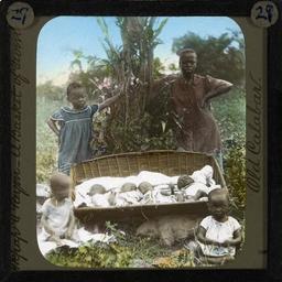| Keywords: A basket of Twin Babies, Old Calabar, late 19th century (imp-cswc-GB-237-CSWC47-LS2-029).jpg en <br> A basket of Twin Babies Old Calabar late 19th century Image of a woven basket containing two sets of twin babies There are two older children standing behind the basket and two seated in the foreground of the picture ; It was the belief in Calabar that if a woman had twins one of them had to be a devil so the twins were left in the jungle to die Mary Slessor the Scottish Missionary successfully fought against the practice of killing twins at infancy and herself saved many twins from this fate Photographer Unknown Filename imp-cswc-GB-237-CSWC47-LS2-029 tif Coverage date circa 1880 Part of collection International Mission Photography Archive ca 1860-ca 1960 Type images Part of subcollection Photographs from the Centre for the Study of World Christianity University of Edinburgh U K ca 1900-ca 1940s Repository name Centre for the Study of World Christianity Archival file impaunpub_Volume7/1302 url Repository address The University of Edinburgh School of Divinity New College Mound Place Edinburgh EH1 2LX United Kingdom Geographic subject country Nigeria Format aacr2 1 lantern slide 8 x 8 cm Geographic subject continent Africa Rights Contact the repository for details Part of series Mary Slessor LS2 Repository email divinity-CSWC ed ac uk Subject lcsh Keyword Human rights; Twins Date created circa 1880 Publisher of the digital version University of Southern California Libraries Subject aat genre group portraits Format aat lantern slides Legacy record ID impa-m68172 Access conditions http //www ed ac uk/schools-departments/divinity/research/centres/world-christianity/collections-resources File GB 237 CSWC47/LS2/29 1880 author http //digitallibrary usc edu/cdm/ref/collection/p15799coll123/id/64425 PD-old-70-1923 Magic lantern images Images from USC Digital Library uploaded by Fæ International Mission Photography Archive ca 1860-ca 1960 Murder Human twins Calabar |