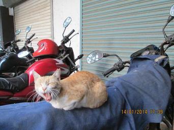 Keywords: A cat yawn on a 'Motorcycle'..JPG en A cat sitting on a parked motorcycle and enjoying itself own Rudolph A Furtado Tuesday 14-1-2014 Cc-zero Yawning cats Red tabby cats Cats and wheels Honda motorcycles Taken with Canon PowerShot A810