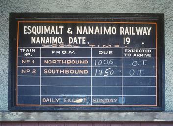 E&N Train Board at Namaimo, BC in October 1979. A Couple Esquimalt and Nanaimo Rwy (Vancouver Island) Photos (26906133044).jpg en These are Roger Puta's <br> E N Train Board at Namaimo BC in October 1979 2016-06-06 22 14 35 https //www flickr com/people/129679309 N05 railfan 44 https //www flickr com/photos/129679309 N05/26906133044/ User Fæ/Flickr API Puta's Canadian Roads other than CP and CN North American Railroads Mel Finzer RogerPuta Photographs by Roger Puta Photos uploaded from Flickr by Fæ using a script 1979 in rail transport in Canada |