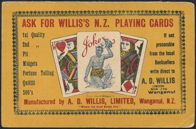 | Keywords: An advertisement for playing cards for Pit, Midgets, Fortune telling, Quittit, 500s. Shows three cards, a Maori warrior as a joker in the centre, flanked by a Jack of Hearts and a Jack of Diamonds. Quantity: 1 colour photo-mechanical print(s). Physical Description: Offset print, 120 x 183 mm. Archibald Dudingston Willis (Firm). A D Willis Ltd :Ask for Willis's N.Z. playing cards. Manufactured by A D Willis, Limited, Wanganui, N.Z. [Blotter. ca 1920s?]. Ref: Eph-A-BLOTTER-1920s-01. Alexander Turnbull Library, Wellington, New Zealand. natlib.govt.nz/records/22738050 An advertisement for playing cards for Pit, Midgets, Fortune telling, Quittit, 500s. Shows three cards, a Maori warrior as a joker in the centre, flanked by a Jack of Hearts and a Jack of Diamonds. Quantity: 1 colour photo-mechanical print(s). Physical Description: Offset print, 120 x 183 mm. Archibald Dudingston Willis (Firm). A D Willis Ltd :Ask for Willis's N.Z. playing cards. Manufactured by A D Willis, Limited, Wanganui, N.Z. [Blotter. ca 1920s?]. Ref: Eph-A-BLOTTER-1920s-01. Alexander Turnbull Library, Wellington, New Zealand. natlib.govt.nz/records/22738050 |
