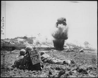 | Keywords: A demolition crew from the 6th Marine Division watch dynamite charges explode and destroy a Japanese cave. Okinawa... - NARA - 532557.tif Scope and content General notes Use War and Conflict Number 1227 when ordering a reproduction or requesting information about this image 532557 Local identifier 127-N-122154 Department of Defense Department of the Navy U S Marine Corps 09/18/1947 - Still Picture Records Section Special Media Archives Services Division NWCS-S National Archives at College Park 8601 Adelphi Road College Park MD 20740-6001 1927 - 1981 Record group Record Group 127 Records of the U S Marine Corps 1775 - 9999 Record group ARC 456 General Photograph File of the U S Marine Corps compiled 1927 - 1981 documenting the period 1775 - 1981 Series ARC 532396 File unit File unit ARC Variant control numbers NAIL Control Number NWDNS-127-N-122154 yes Other versions NARA-cooperation PD-USGov 6th Marine Division United States in World War II Battle of Okinawa |