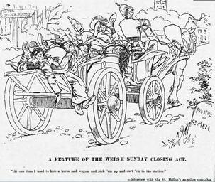 | Keywords: A Feature of the Welsh Sunday Closing Act -JM Staniforth.png en Political cartoon by JM Staniforth A comedic representation of an interview by a police officer of St Mellons on the fallout of the introduction of the Welsh Closing Act of 1881 http //papuraunewyddcymru llgc org uk/en/page/view/3282828 Evening Express Joseph Morewood Staniforth 1899-02-03 Cartoons by Joseph Morewood Staniforth 1899 in Wales 1890s political cartoons Wagons in art Drunken males Drunken people in art St Mellons PD-old-70-1923 |