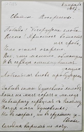 | Keywords: A.Fet's authograph's - Svetloe voskresenie (1857).jpg Фет А А Светлое воск есенье Победа Безо ужна злоба 8 ап еля 1957 г Автог аф ИОР РГБ Ф 315/l е х 26 http //www rsl ru/ru/s7/s381/2015/fet 1957 Фет А А Afanasy Fet Files uploaded by Shakko from various sources PD-old |