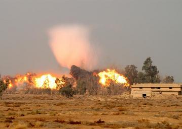 | Keywords: A fireball and shockwave cone shoot into the sky DVIDS13755.jpg en A fireball and shockwave cone shoot into the sky in Taji north of Baghdad The white mist cloud was created when two shockwaves of simultaneously exploding bombs met Explosive ordnance disposal technicians detonated the last seven one thousand pound bombs in Taji Dec 16 3rd Brigade 1st Armored Division was tasked with management of the Taji Ammo Dump known as Area Echo and diligently worked with contractors and explosive ordnance disposal teams to clear the compound of all munitions Nearly twenty-thousand tons of munitions were destroyed in Area Echo and the removal these munitions was a significant task that added to the safety of Coalition Forces and the Iraqi people Photo by Staff Sgt Kevin Bromley C Team 100th MPAD 3rd Bde 1AD PAO 2005-12-16 https //www dvidshub net/image/13755 13755 2005-12-21 08 47 TAJI IQ PD-USGov 1st Armored Division United States Images from DoD uploaded by Fæ |