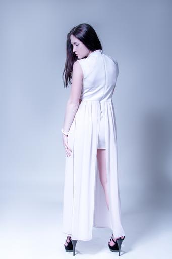 Keywords: a girl in a long dress girl woman model fashion shoes queen wall beauty female hands white dress hairstyle photoshoot style female hands studio