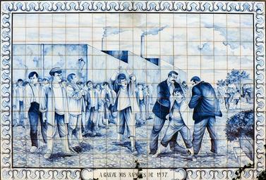Keywords: A greve dos rapazes de 1937.jpg 2006-02-06 own assumed Juntas Azulejos in Sacavém 20th-century azulejos Blue and white azulejos Azulejos of people Azulejos of males Fábrica de Sacavém