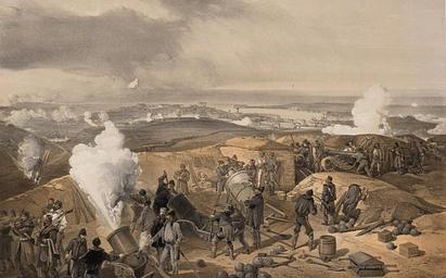 | Keywords: A hot day in the batteries.jpg Artwork en Print shows action in a British artillery battery mortar fire mortars and cannon being loaded the removal of wounded and in the distance the fortifications of Sevastopolʹ W Simpson delt ; E Walker lith 38 4 x 57 1 print lithograph tinted accession number LC-DIG-ppmsca-05697 digital file from original print Institution Library of Congress ppmsca 05697 Rights Advisory No known restrictions on publication Title from item Plate in The seat of war in the east Dedicated by permission to Her most gracious Majesty the Queen / William Simpson First series London Published by Paul Dominic Colnaghi Co publishers to Her Majesty 13 14 Pall Mall East ; Paris Goupil Cie 1855 plate 34 Colnaghis' authentic series Attached to the edge of the sheet is a printed Key to a hot day which identifies principal fortifications in Sevastopolʹ PD-100 William Simpson Uploaded with UploadWizard |