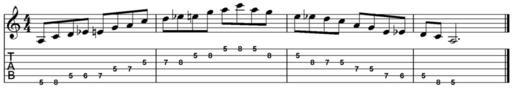 Keywords: A minor pentatonic for guitar inc blue notes.png en A minor pentatonic scale for guitar including blue notes two octaves at the fifth fret in tab and notation Own Sluffs 2009-07-30 Created by author using Sibelius software Scales on guitar