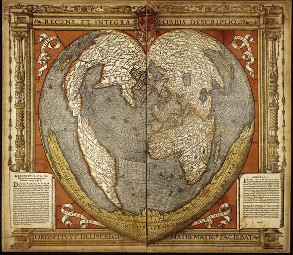 | Keywords: A Modern and Complete Map of the World by the Royal Mathematician Oronce Fine of the Dauphiné WDL4072.png Artwork ru Фине О онс 1494-1555 гг fr Fine Oronce 1494-1555 en Finé Oronce 1494-1555 zh 费恩 欧龙斯,1494-1555 年 pt Finé Oronce 1494-1555 ar أورانس فين، 1494 - 1555 es Fine Oronce 1494-1555 ru Сов еменная полная ка та ми а составленная ко олевским математиком О онсом Фине из Дофине fr Une carte moderne et complète du monde par le mathématicien royal Oronce Finé du Dauphiné en A Modern and Complete Map of the World by the Royal Mathematician Oronce Fine of the Dauphiné zh 多菲内皇家数学家欧龙斯·费恩绘制的现代版完整世界 图 pt Um mapa múndi moderno e completo pelo matemático real Oronce Finé de Delfinado ar خريطة حديثة وكاملة للعالم أنشأها عالم الرياضيات الملكي أورانس فين من أبناء مقاطعة دوفين ru Аст оном и математик с 1531 г возглавлявший кафед у математики в Ко олевском колледже в настоящее в емя Коллеж де Ф анс О онс Фине 1494 1555 гг был одним из пе вых ф анцузских ученых-ка тог афов Созданная им ка та ми а в фо ме се дца является одной из 18 ка т составленных в се дцевидной п оекции и изданных в пе иод с 1511-го по 1566-ой год Основанная на одной из п оекций описанных геог афом II в Птолемеем данная п оекция была п иведена в систему математиком из ю нбе га Йоханнесом Ве не ом 1468 1522 гг в сочинении написанном в 1514 г Ка та Фине от ажает состояние науки того в емени существовавшие геог афические гипотезы и неоп еделенности Севе ная Аме ика соединена с Азией а на юге изоб ажена ог омная <em>Terra Australis</em> Южная земля гипотетический континент кото ый по п едположениям геог афов должен был у авновешивать массу земель севе ного полуша ия Ка та находилась в коллекции геог афа Жана-Батиста Бу гиньона д'Анвиля 1697 1782 гг В 1779 г она была п иоб етена ко олем Людовиком XVI а в 1924 г пе едана на х анение в ациональную библиотеку Ф анции <br>Ка ты ми а fr Astronome et mathématicien titulaire dès 1531 de la première chaire de mathématique du Collège royal aujourd hui Collège de France Oronce Fine 1494-1555 est l un des premiers savants français à faire œuvre de cartographe Sa mappemonde en forme de cœur appartient à un groupe de 18 cartes en projection cordiforme éditées entre 1511 et 1566 Inspiré de l une des projections décrites par le cartographe du IIe siècle Ptolémée ce système de projection fut codifié par un mathématicien de Nuremberg Johannes Werner 1468-1522 dans un opuscule daté de 1514 La carte de Fine reflète les hypothèses et incertitudes de l époque en matière de géographie L Amérique du Nord est reliée à l Asie et une vaste <em>Terra Australis</em> continent imaginé que les géographes supposaient exister pour équilibrer le poids des masses terrestres septentrionales a été dessinée au sud Cette carte provient de la collection du géographe Jean-Baptiste Bourguignon d'Anville 1697-1782 Elle fut achetée par le roi Louis XVI en 1779 et déposée à la Bibliothèque nationale de France en 1924 <br>Cartes du monde en An astronomer and mathematician from 1531 the first chair of mathematics in the Collège Royal the present-day Collège de France Oronce Fine 1494 1555 was one of the first French scholars to work with cartography His world map in the shape of a heart belongs to a group of 18 heart-shaped projection maps published between 1511 and 1566 Inspired by one of the projections described by the second-century geographer Ptolemy this projection system was codified by a mathematician in Nuremberg Johannes Werner 1468 1522 in an opus written in 1514 Fine s map reflects the state of knowledge and the geographic hypotheses and uncertainties of its day North America is joined with Asia and a vast <em>Terra Australis</em> a hypothetical continent that geographers posited had to exist to counterbalance the weight of the northern land masses is drawn in the south The map is from the collection of the geographer Jean-Baptiste Bourguignon d'Anville 1697 1782 It was purchased by King Louis XVI in 1779 and deposited in the National Library of France in 1924 <br>World maps zh 欧龙斯·费恩(Oronce Fine,1494 1555 年)是 位的天文学家和数学家,1531 年担任巴黎皇家学院(今天的法兰西学院)的首任数学系主任,是法国 早从事 图制 的学 之 这幅由他制 的心形世界 图是 1511 和 1566年出版的 18 幅心形投影 图之 受到纽伦堡数学家约翰·维尔纳(Johannes Werner,1468 1522 年) 其 1514 年编写的 品其中 幅由 2 世纪 理学家托勒密 Ptolemy 制 的投影图的启发,费恩的这幅 图反映出当时的知识程度,以及 理学上的假设推测和不确定 北美洲与亚洲相连, 南方绘 个广阔的<em>南方大陆</em>,因为 理学家认为,必须存 这样 假设的大陆,才能平衡北方大陆的重量 这幅 图是属于 理学 让-巴蒂斯特·昂维尔(Jean-Baptiste Bourguignon d'Anville,1697 1782 年)的收藏品,1779 年被国王路易十六世 Louis XVI 购得,1924 年