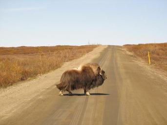 Keywords: musk ox crossing road wildlife animal Alaska