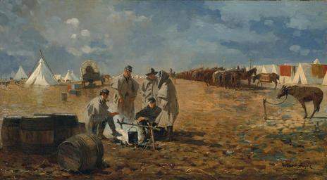 | Keywords: A Rainy Day in Camp by Winslow Homer 1871.jpeg Artwork en A Rainy Day in Camp also known as Camp near Yorktown oil canvas cm 50 8 91 4 Metropolitan Museum of Art Gallery 762 accession number 23 77 1 object history William F Milton New York and Pittsfield Massachusetts 1871 “died 1905; his wife 1905 “1923 credit line Gift of Mrs William F Milton 1923 Signature at lower right over two former signatures WINSLOW HOMER / 1871; at left on barrel HOMER art database 1871 http //www metmuseum org/Collections/search-the-collections/20011491 The Metropolitan Museum of Art Winslow Homer - Rainy Day in Camp jpg PD-old-auto-1923 1910 DEFAULTSORT Winslow Homer - Rainy Day in Camp Oil paintings by Winslow Homer 1870s paintings by Winslow Homer Paintings by Winslow Homer in the Metropolitan Museum of Art Paintings of the American Civil War |